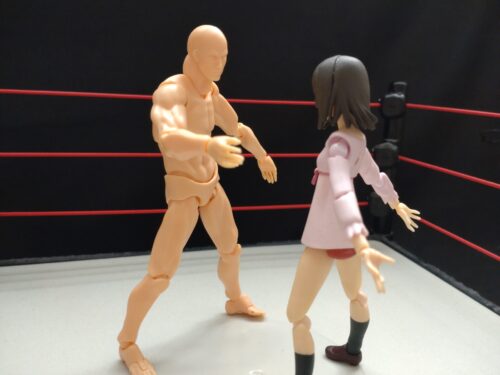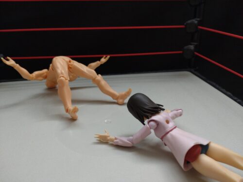 相手の胸に正面飛びのドロップキック