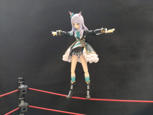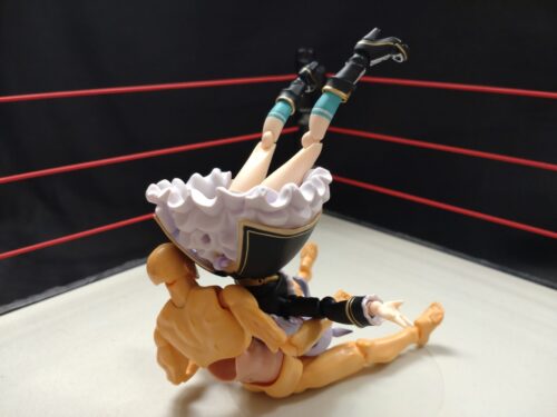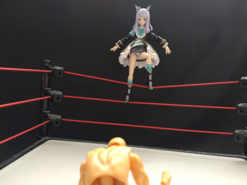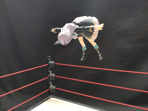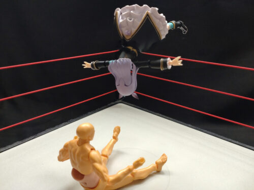 リング中央へ相手を座らせて、エプロンに出てロープに乗る